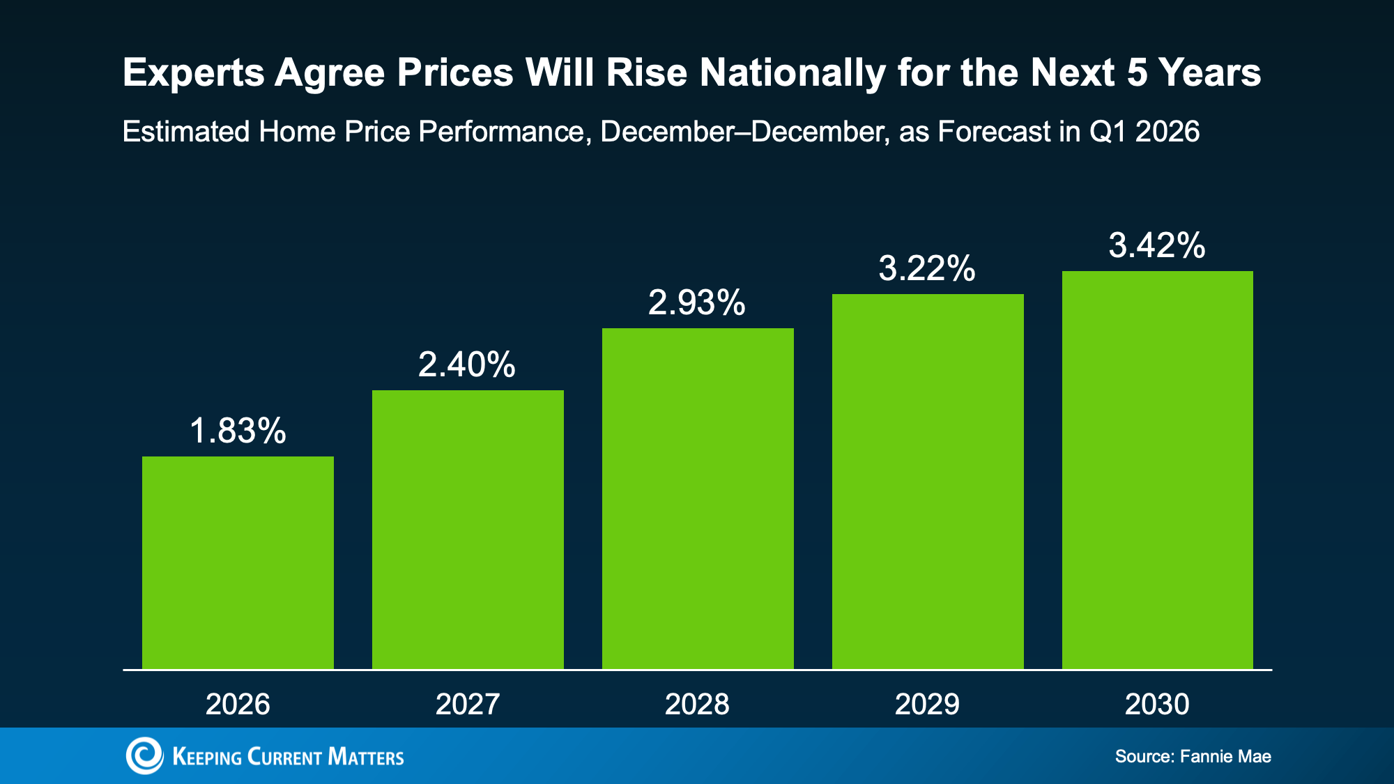In fact, Fannie Mae surveyed over 100 housing market experts to ask their opinions on where prices are headed from here. And the experts agree, nationally, prices are expected to keep rising over the next five years: